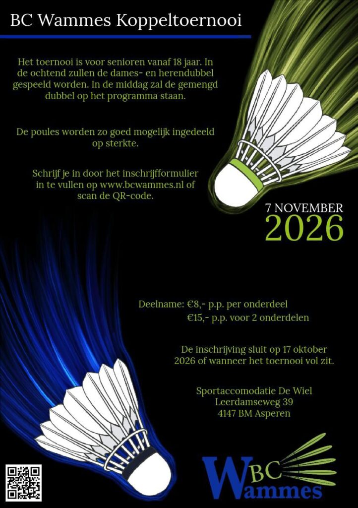 Op zaterdag 7 november 2026 organiseren wij weer het BC Wammes koppeltoernooi. Zie onderstaande flyer voor informatie.